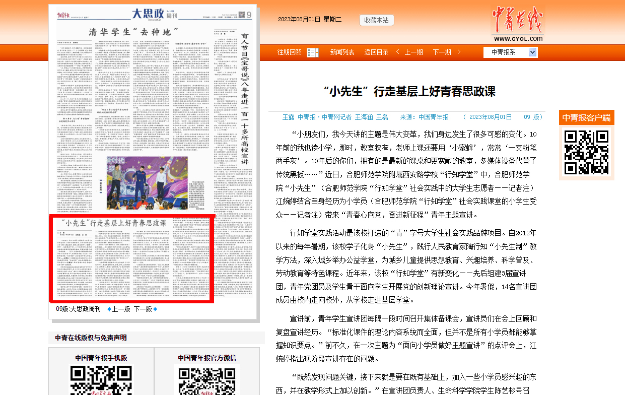 此次行知学堂是学院和首次联合桥头集镇中学开展行知学堂,小先生们与38名小学员在为期28天的实践活动中朝夕相处,共同收获了欢乐和成长,并赢得当地家长和学员们的一致好评,中国青年报对此进行了报道。(Beat365中文官方网站:周玉)