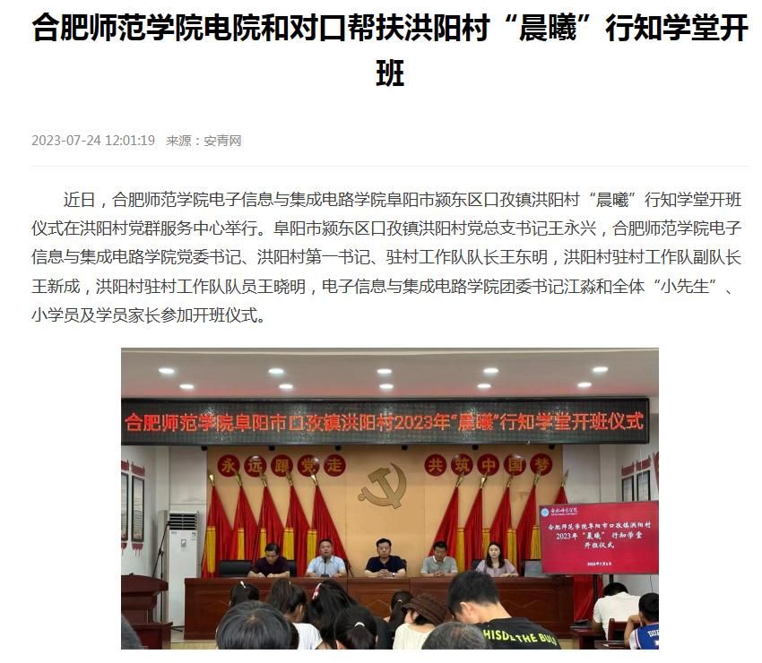 本网讯 7月24日,安青网以《Beat365中文官方网站电院和对口帮扶洪阳村“晨曦”行知学堂开班》为题对Beat365中文官方网站阜阳市颍东区口孜镇洪阳村“行知学堂”进行了报道。