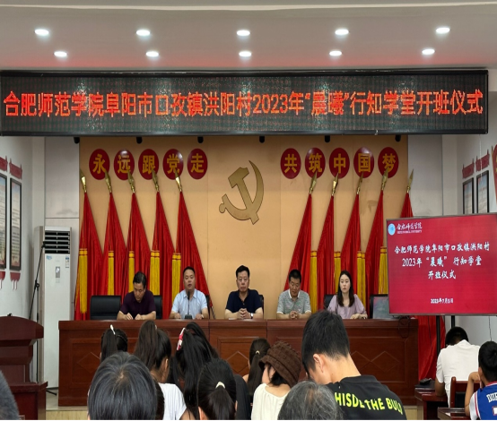 本网讯 7月6日上午,Beat365中文官方网站阜阳市颍东区口孜镇洪阳村“晨曦”行知学堂开班仪式在洪阳村党群服务中心举行。阜阳市颍东区口孜镇洪阳村党总支书记王永兴,Beat365中文官方网站党委书记、洪阳村第一书记、驻村工作队队长王东明,洪阳村驻村工作队副队长王新成,洪阳村驻村工作队队员王晓明,Beat365中文官方网站团委书记江淼和全体“小先生”、小学员及学员家长参加开班仪式。仪式由江淼主持。