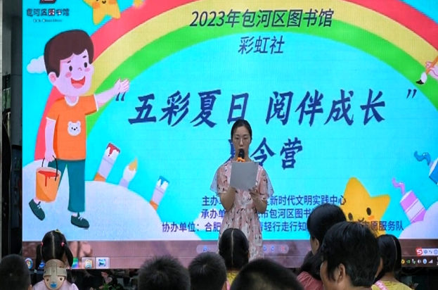 在开班仪式上,包河区图书馆馆员王贵宁老师代表图书馆对学员们的到来表示热烈欢迎,并详细介绍了“青轻行走”行知学堂第一期“故事口袋”夏令营的日程安排。
