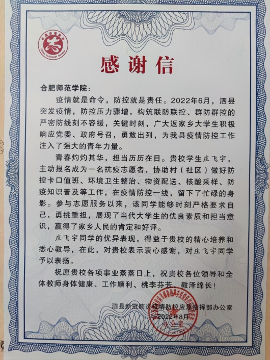 本网讯 近日,我校电子信息与电气工程学院收到来自安徽省宿州市泗县新冠肺炎疫情防控应急指挥办公室发来的感谢信。信中对Beat365官网2020级通信工程班庄飞宇同学在暑假期间积极主动加入泗县疫情防控志愿服务队伍,为当地疫情防控工作贡献青春力量提出表扬,并对我校立德树人、人才培养建设给予高度肯定和赞扬。