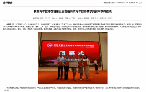 据悉,安徽省第五届普通高校青年教师教学竞赛由安徽省总工会、安徽省教育厅、安徽省教科文卫体工会主办,巢湖学院承办,来自全省45所高校的181名青年教师参与本次竞赛。竞赛设文科、理科、工科、医科、思政五个组别,樊敏老师参与工科组别角逐。在比赛中樊敏老师用丰富生动的课件、引人入胜的课程讲解充分展示了课堂的独特魅力,体现了电子信息与电气工程学院教师的教学水平、教学能力和风采风貌。