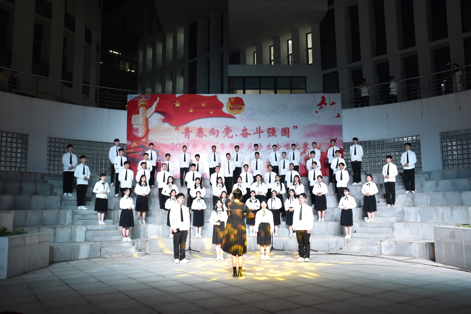 此次比赛,电院合唱队第13个出场,也是最后一个出场的参赛队伍,演唱曲目是《光荣啊,中国共青团》与《国家》。随着音乐的旋律响起,合唱队的女生们身着一袭白色衬衣黑色半裙,显得格外清爽亮丽;男生们则一身白衬衫青年装,配以红色校徽,充满青春朝气。庄严整齐的服饰尽显电院学子昂扬向上的风貌。