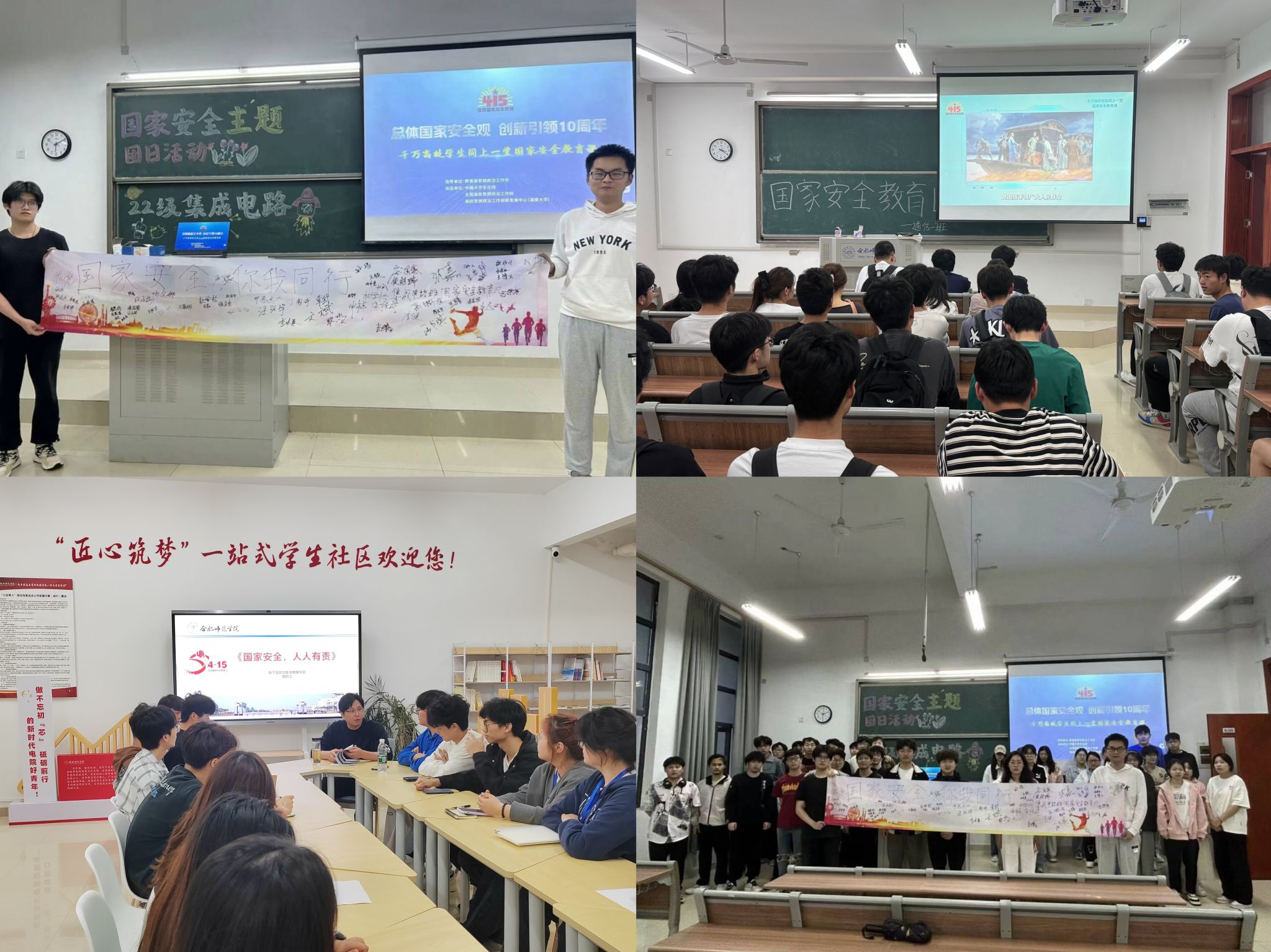 在班级教室里,辅导员们举行国家安全教育日主题班会,通过图片、视频等多种形式向学生介绍了国家安全日的设立和重要意义,2022级同学还开展了“国家安全,守护有我”承诺签名活动。在学院一站式学生社区里,学院团委周司文老师组织学生骨干开展“国家安全,人人有责”学习研讨会,结合学生生活实际,通过分析视频案例、个人分享、交流讨论等形式,帮助学生深入理解总体国家安全观,切实增强维护国家安全的责任感、使命感。