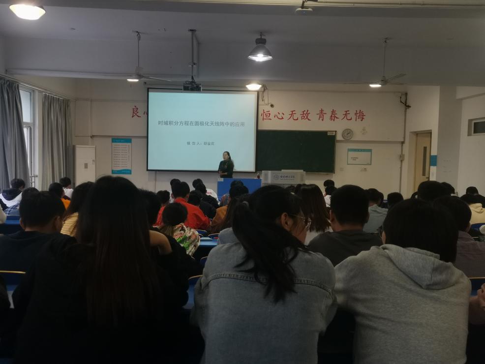 本网训,10月13日电子信息与电气工程学院胡金花老师在锦绣校区逸夫楼306作“时域积分方程在圆极化天线阵中的应用”学术报告,电子信息工程专业学生聆听了本次报告。