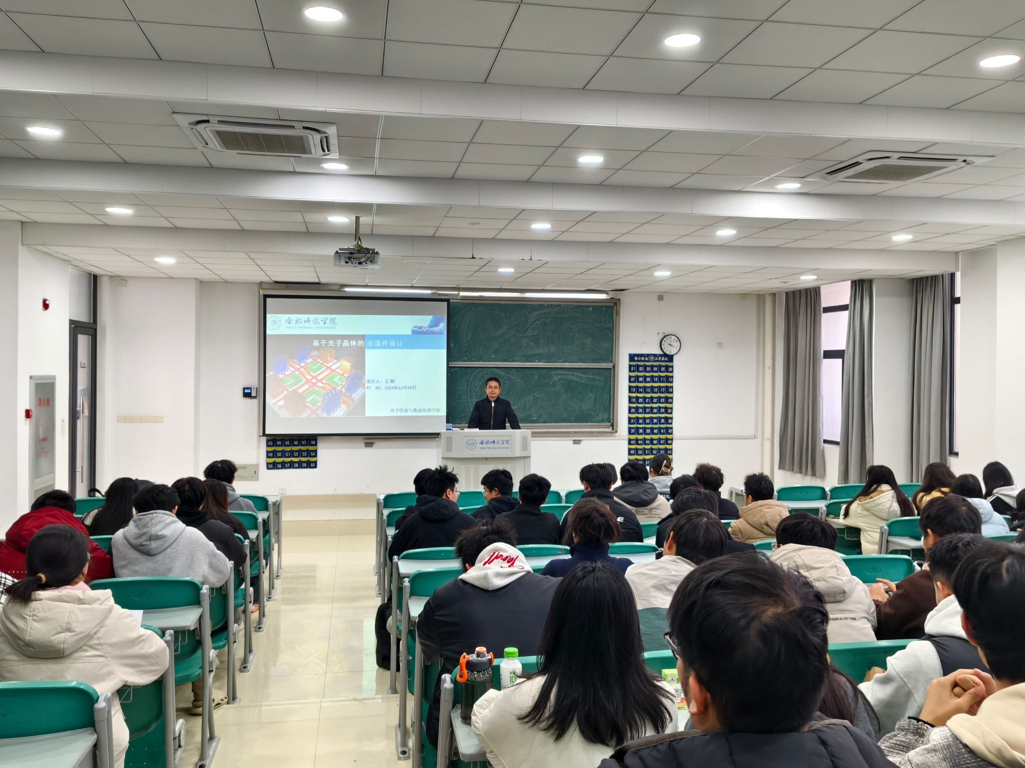 12月18日下午,Beat365中文官方网站王辉博士在滨湖校区博学楼C203教室,作题为“基于光子晶体的光器件设计”的学术报告。学院电子信息工程专业百余名学生到场聆听,共同探索光子晶体的物理奥秘与技术前沿。本次讲座旨在拓宽学生在微纳光学与光子学领域的认知视野,强化专业学习的理论深度与实践导向。