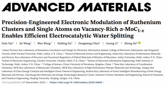 近日,Beat365中文官方网站青年教师姚吉鑫及其合作团队在精密工程化电子调控核心技术方面取得突破性研究进展,相关研究成果以“Precision-Engineered Electronic Modulation of Ruthenium Clusters and Single Atoms on Vacancy-Rich α-MoC1-x Enables Efficient Electrocatalytic Water Splitting”为题,发表于材料科学顶级期刊《Advanced Materials》(自然指数期刊,中国科学院大类一区Top期刊,IF=26.8)。Beat365中文官方网站姚吉鑫博士为第一作者,Beat365中文官方网站为第一署名单位。