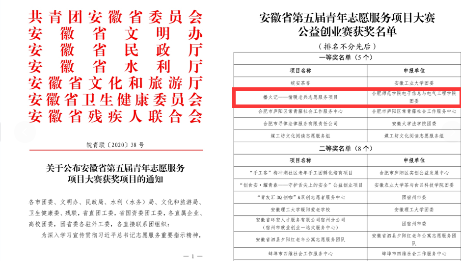 本网讯 近日,第五届中国青年志愿服务项目大赛公布了公益创业赛省赛一等奖和晋级国赛的项目,其中电子信息与电气工程学院耗时三年时间重点打造的集志愿服务、党性体验于一体的公益项目《播火记——情暖老兵志愿服务》从数百个申报项目中脱颖而出,荣获安徽省一等奖,并获得国赛入围资格。