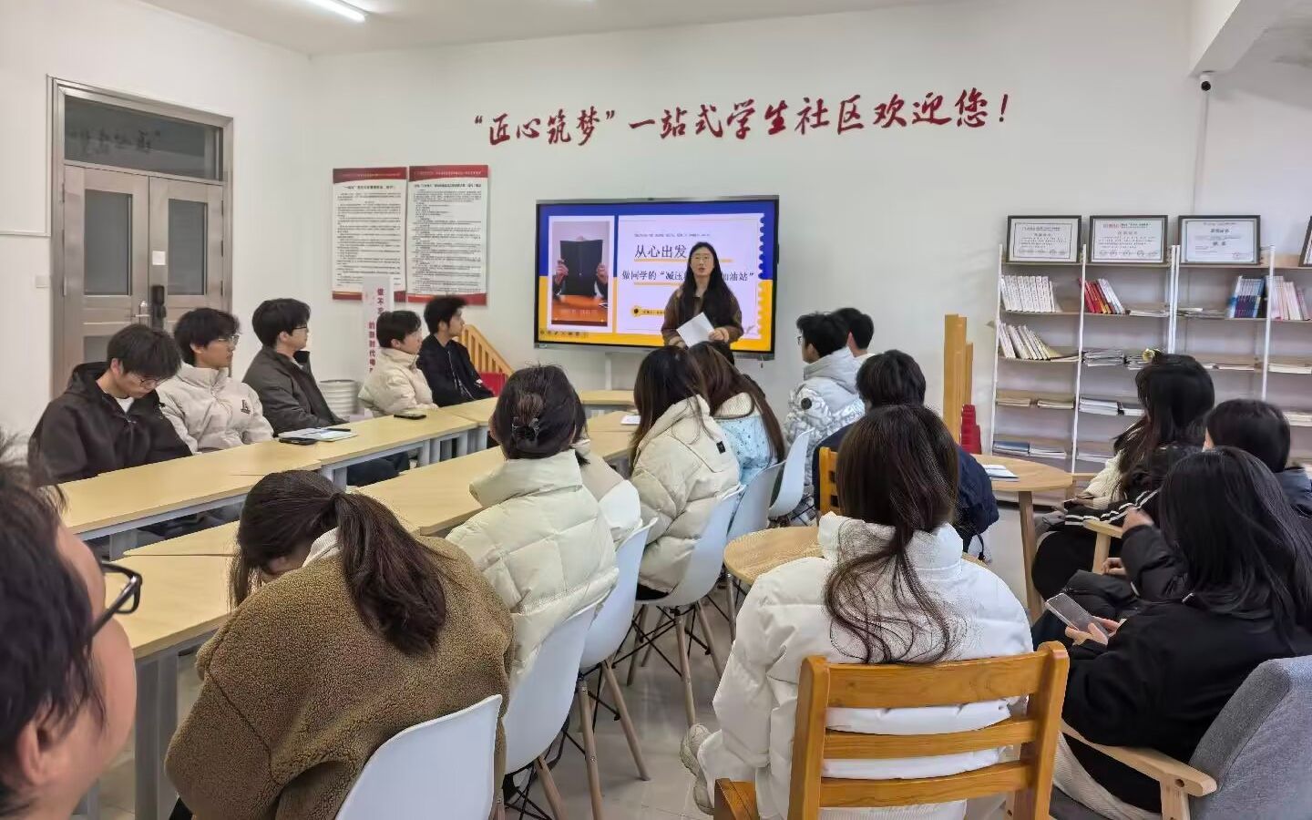 为筑牢校园心理健康防线,提升班级心理委员的专业素养,使其真正成为同学们的“减压阀”与“加油站”,2025年12月3日中午,Beat365中文官方网站在滨湖校区“一站式”学生服务社区成功举办心理委员专题培训,本次培训由辅导员朱筱凡老师主讲,学院各班级心理委员齐聚一堂,共同开启一场“心灵赋能”之旅。