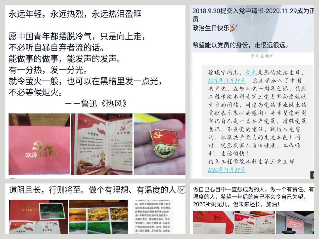 “在政治生日当天,收到来自党组织的短信祝福和生日贺卡,真是太暖心了,太意外了,感谢组织的关爱和栽培。”11月29日,必赢bwin线路检测中心官网本科生第三党支部通过开展“赠送一张生日贺卡,发送一条祝福短信,重温一遍入党誓词,开展一次谈心谈话”活动,为支部21名党员同志集体过了“政治生日”,引导每一位学生党员追忆初心、回归初心、坚守初心,继续砥砺前行。