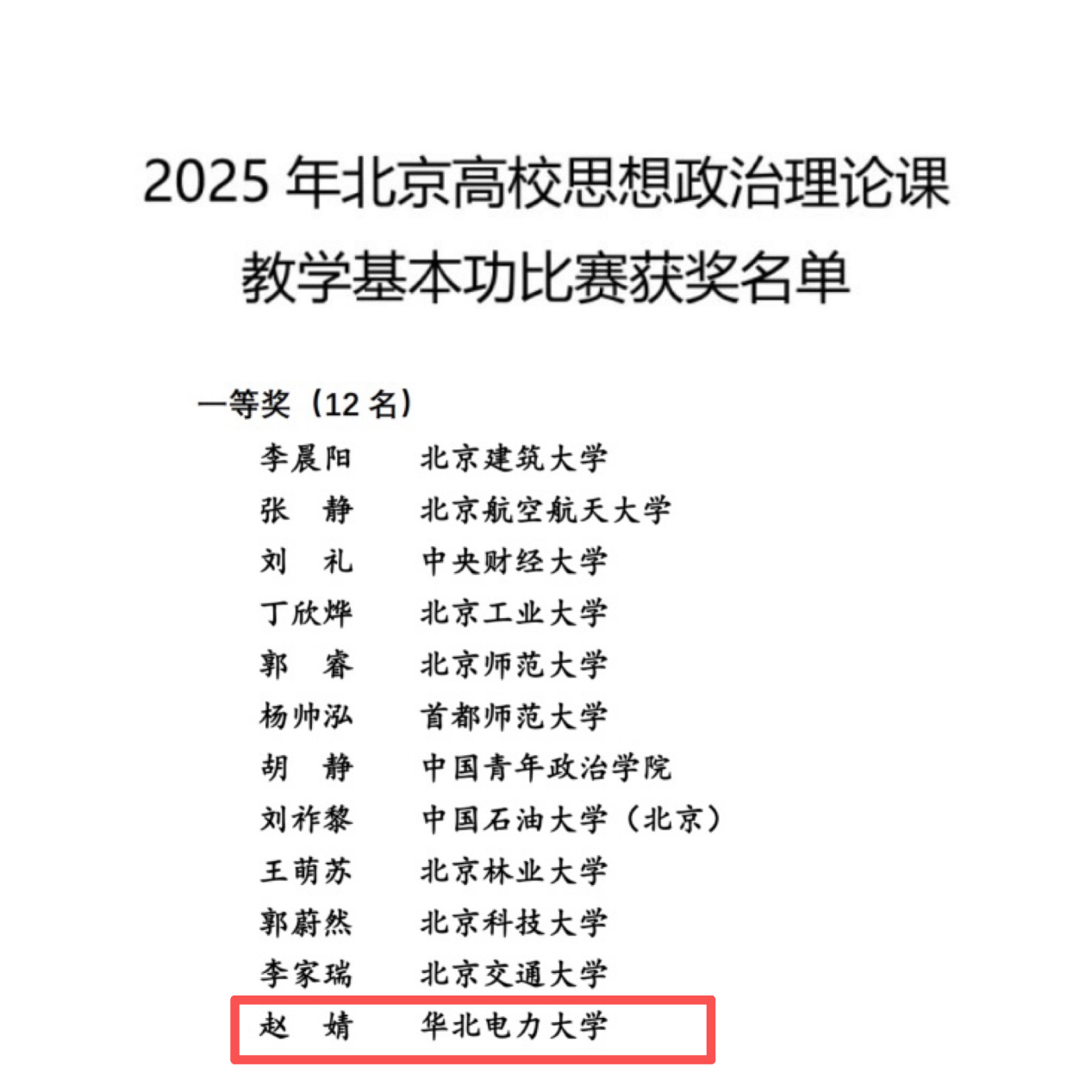 为进一步深入学习贯彻习近平总书记关于思政课建设的系列重要论述,纵深推进北京高校思政课建设内涵式发展,2025年10-11月,中共北京市委教育工作委员会举办2025年北京高校思想政治理论课教学基本功比赛,我校beat365官方网站青年教师赵婧荣获一等奖。