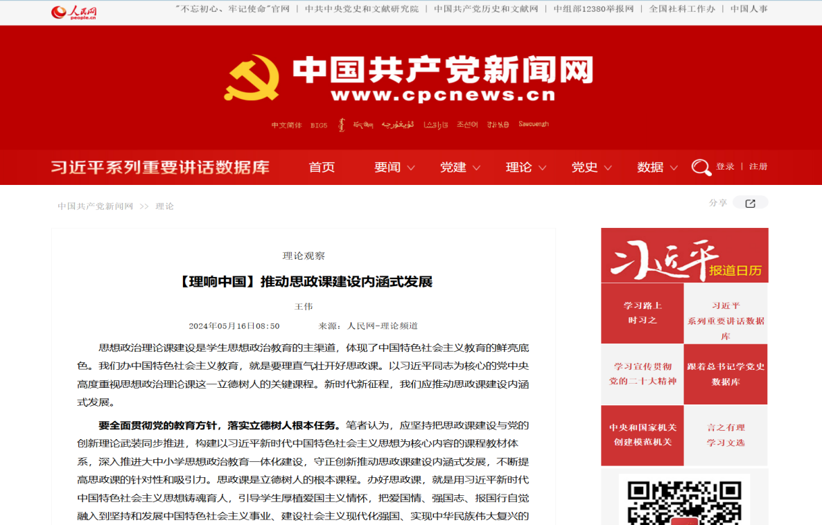 2024年5月16日,beat365官方网站院长王伟在人民网理论频道发表《推动思政课建设内涵式发展》文章。