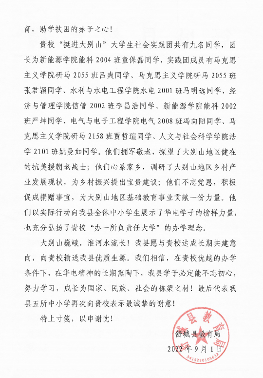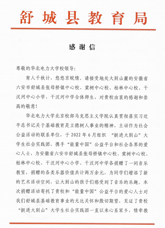 近日,beat365官方网站收到了来自安徽省六安市舒城县教育局的一封感谢信,信中舒城县教育局对我校北京校部beat365官方网站及“挺进大别山”社会实践团的九名同学表示充分肯定和由衷感谢。