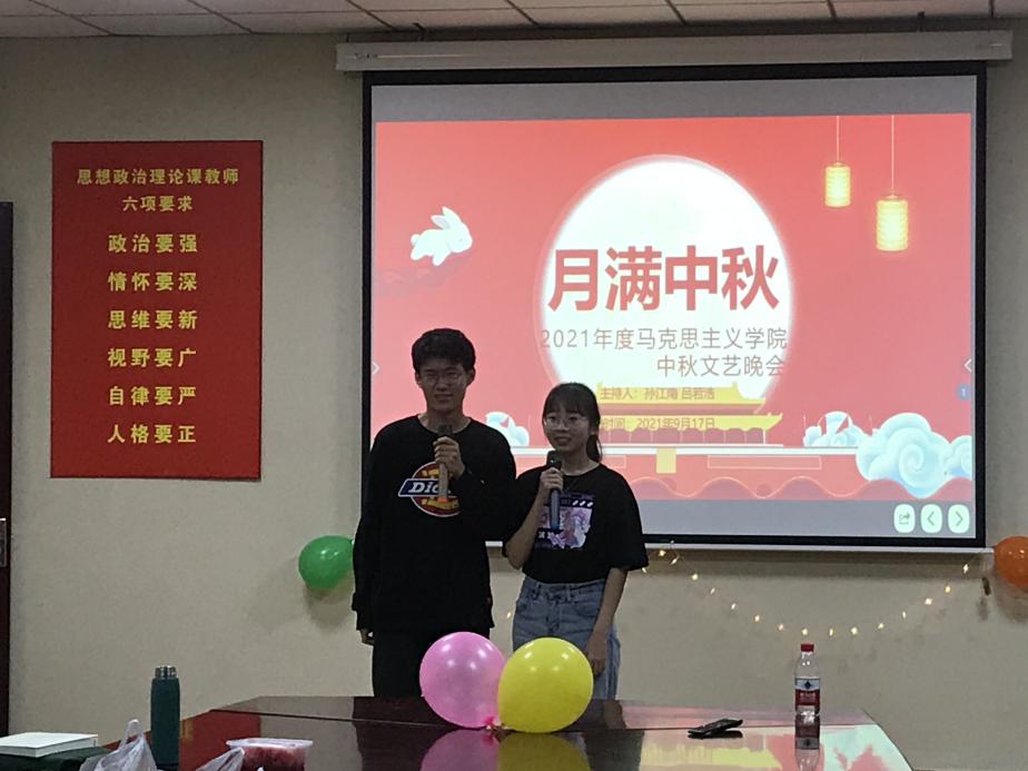 主持人孙江南、吕若浩在给老师们和同学们送去祝福之后,由李梦瑶、申田歌、王紫荆、吕若浩、谭钰霏、张艺可带来开场舞蹈《明月几时有》,活力四射的舞蹈跳出了中秋的欢腾,用扇子摆出了的“中”、“秋”、“快”、“乐”等字,迎来了阵阵掌声,瞬间将晚会的气氛带到了高潮,展现了马院师生朝气蓬勃的精神面貌。