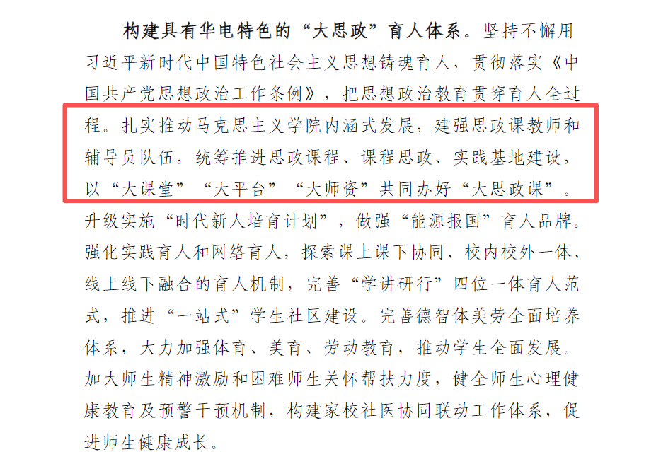 校党委书记汪庆华走进思政课堂,以“红军长征与遵义会议”为题讲授专题思政课,内容学理透彻、贯通古今、生动鲜活,激励师生奋进新征程、建功新时代。举办7期“央企领导进课堂”系列活动,有效搭建了理论与实践、校园与社会连接的桥梁,丰富了教学资源,提升了育人实效。加强与昌平区深度开展“大思政课”建设,与昌平区新时代文明实践中心、小汤山镇新时代文明实践所结对共建,在居庸关长城举办首场文明实践理论宣讲活动,挂牌“大思政课”实践教学基地,并开展志愿服务活动;赴北京思特奇公司开展研究生“大思政课”实践教学,推动理论与企业党建、文化创新实践相结合,构建校内课堂与社会大课堂联动的育人新格局。