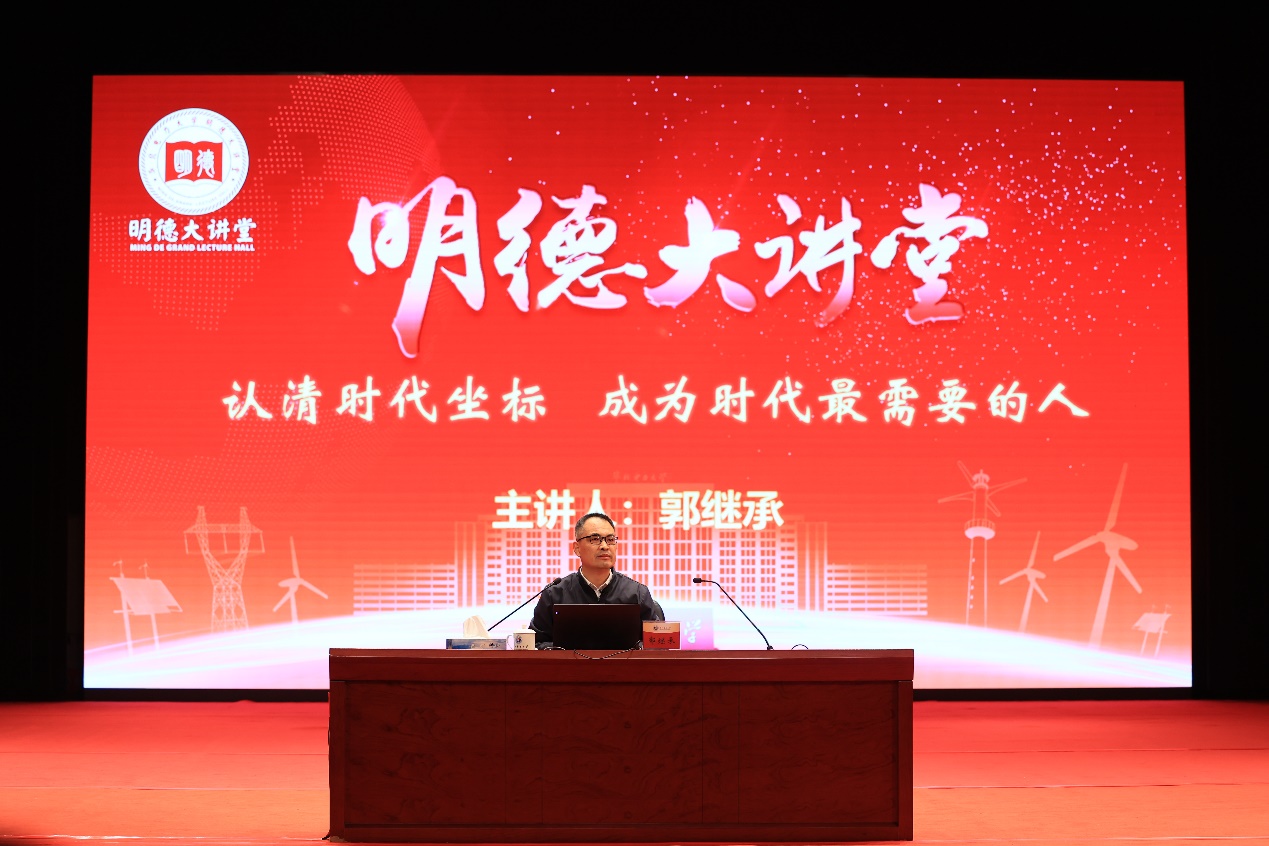 11月8日,学校在主楼礼堂举办第四十一期明德大讲堂,邀请中国政法大学思政研究所教师郭继承作《认清时代坐标 成为时代最需要的人》专题报告。