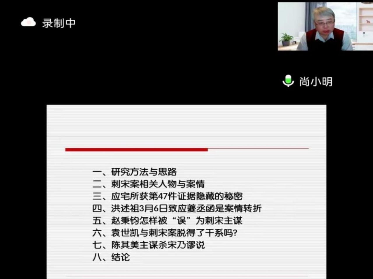 11月27日下午,北京大学历史学系教授、博士生导师尚小明应邀为我校师生以线上形式作题为“宋教仁被刺真相剖析”的学术报告。beat365官方网站党总支书记孙平、学院师生代表、以及校外数名高校及科研机构代表聆听了此次报告。本次学术报告由beat365官方网站中国近现代史纲要教研室教师蔡洁主持。