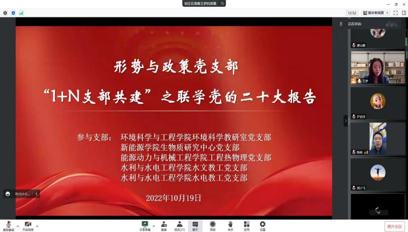 为深入学习党的二十大报告精神,10月19日中午,beat365官方网站形势与政策党支部联合环境科学与工程学院环境科学教研室党支部、新能源学院生物质发电研究中心党支部、能源动力与机械工程学院工程热物理党支部、水利与水电工程学院水文教工党支部、水电教工党支部开展了共建联学活动。本次活动以线上线下相结合的方式进行,共有37名教师参加,由形势与政策党支部书记王梦主持。