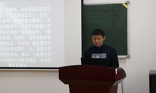 随后,孙平副院长发表讲话,他首先对各位学生干部过去一年的工作做出肯定,对他们的辛勤付出表示衷心的感谢。在学院党总支的领导下,各位学生干部充分展示了其才智与能力,使得活动所取得的成绩越来越好。同时,孙平副院长指出存在的问题,主要表现在下列两个方面:第一,活动偏于日常,特色不鲜明,与学科有所偏差。第二,国学研究由于指导老师的缺失,造成的短板较大,活动太少。鉴于此,他对未来的发展给予以下三点希望:一、研究生会要多走出,吸收和借鉴成功地经验,弥补自身短板,提高活动的专业性,群策群力办好每一场活动;二、学院将本着对学生负责的态度,与老师沟通,积极引进人才,传承国学,提高综合实力和文化软实力;三、积极引导,使学生在思想上,行动上向党组织靠拢。