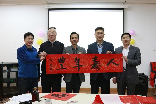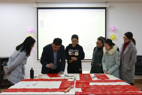 笔会从早上持续到下午,在墨香飘逸中接近尾声。最后,蔡利民老师和苑英科老师以及老师们共同为师生拜年送福字,送上新春的祝福,祝大家新春愉快,“鸡”祥如意。